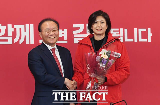 진양혜 전 KBS 아나운서에게 꽃다발을 선물하는 윤재옥 원내대표(왼쪽).