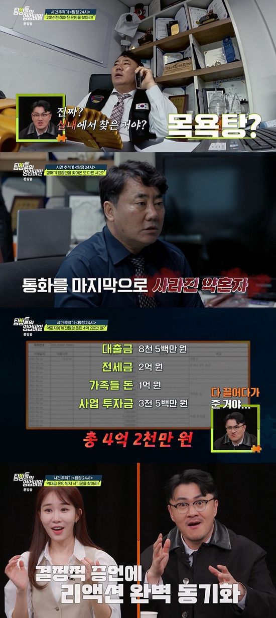 그리고 또 다른 의뢰인이 등장해 “잠적한 약혼자에게 4억 2천만 원을 줬는데, 잠적하고 나니 이름도 사는 곳도 분명치 않더라”고 사람 찾기를 부탁했다. 혼인 빙자 사기가 분명한 사건에 3MC는 경악했다. 탐정단은 외모 말고는 신원미상인 그를 찾기 위해 희미한 실마리를 가지고 유흥가를 탐문했다. 그리고 마침내 방어적인 태도를 취하는 상인들 사이에서 잠적한 약혼자를 알아본 상인이 등장해, 손에 땀을 쥐게 만들었다.