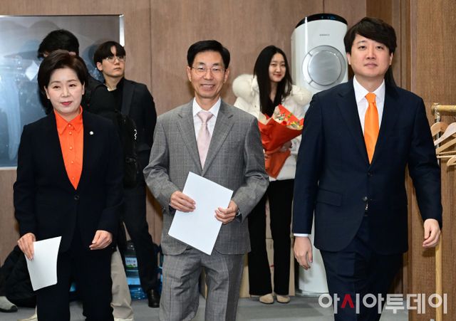 아시아투데이 이병화 기자 = 한국의희망 1호 영입인재인 이창한 전 반도체협회 부회장이 30일 국회 소통관에서 열린 한국의희망 입당 환영식에 참석하고 있다. 왼쪽부터 양향자 한국의희망 대표, 이 전 부회장, 이준석 개혁신당 대표.