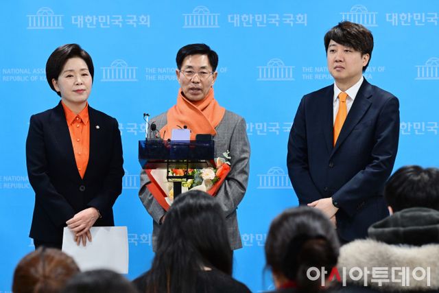 아시아투데이 이병화 기자 = 한국의희망 1호 영입인재인 이창한 전 반도체협회 부회장이 30일 국회 소통관에서 열린 한국의희망 입당 환영식을 마친 뒤 취재진의질문에 답하고 있다. 왼쪽부터 양향자 한국의희망 대표, 이 전 부회장, 이준석 개혁신당 대표.