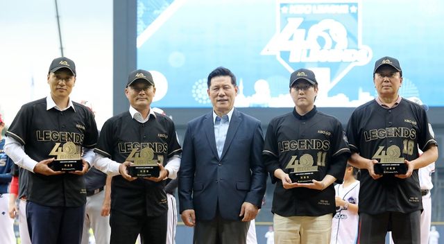 KBO 40주년을 빛낸 4명의 레전드들. (왼쪽부터)이승엽 해설위원, 이종범 전 LG 2군 감독, 허구연 KBO 총재, 최동원 전 코치의 아들 최기호씨, 선동열 전 감독