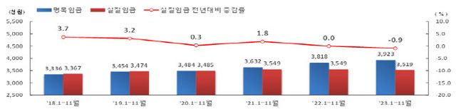 고용노동부가 30일 발표한 ‘2023년 12월 사업체노동력조사 결과’를 보면 지난해 1~11월 근로자 1인당 월평균 실질임금은 351만9000원으로 전년 동기(354만9000원) 대비 0.9% 감소했다. 같은 기간 명목임금은 381만8000원에서 392만3000원으로 2.8% 올랐으나 소비자물가가 3.6% 상승하며 실질임금 인상률이 마이너스를 기록했다.