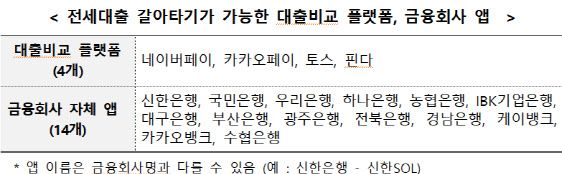 전세 대출 갈아타기를 위해선 네이버페이, 카카오페이 등 4개 대출 비교 플랫폼이나 14개 은행 앱에서 기존 대출을 조회하고, 갈아탈 대출 상품을 비교할 수 있다. 금융위는 “전세대출 갈아타기 서비스는 현재 전세대출 보증기관의 보증기준 등을 감안해 대출을 갈아탈 수 있는 기간이 제한돼 있는데 전세대출 보증기관 등과 협의해 대출을 갈아탈 수 있는 기간을 확대하는 방안을 검토할 계획”이라고 했다.