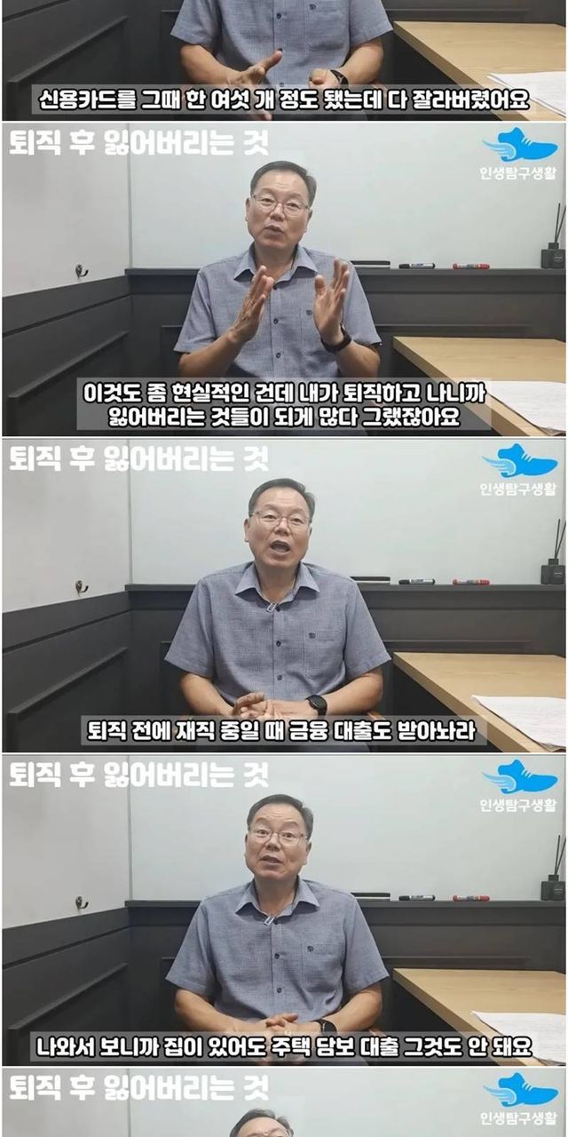 그러면서 "퇴직하면 많은 걸 잃어버린다. 이건 좀 현실적인 건데 금융 대출 같은 건 퇴직 전에 미리 받아놔라. 나와서 보니까 집이 있어도 주택 담보 대출도 통과 안 되더라"고 설명했다.