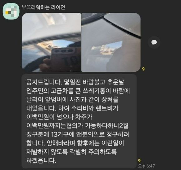 동대표는 공지문을 통해 "며칠 전 큰 쓰레기통이 바람에 날려서 입주민의 고급 차 앞 범퍼에 상처가 났다. 차주가 수리비와 렌트비를 200만원으로 협의했으니 13가구에 N분의 1로 청구하겠다"며 "양해 바라며 향후에는 이런 일이 재발하지 않도록 각별히 주의하겠다"고 통보했다.