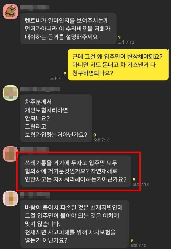 주민들은 반발하고 나섰다. 한 주민은 "렌트비가 얼마인지 보여주시는 게 먼저가 아니라, 수리 비용을 저희가 내야 하는 근거를 설명해달라"고 항의했다. 이어 "쓰레기통을 거기에 두자고 입주민 모두 협의한 것도 아니다. 자연재해로 인한 사고는 자차 처리해야 한다"고 주장했다.