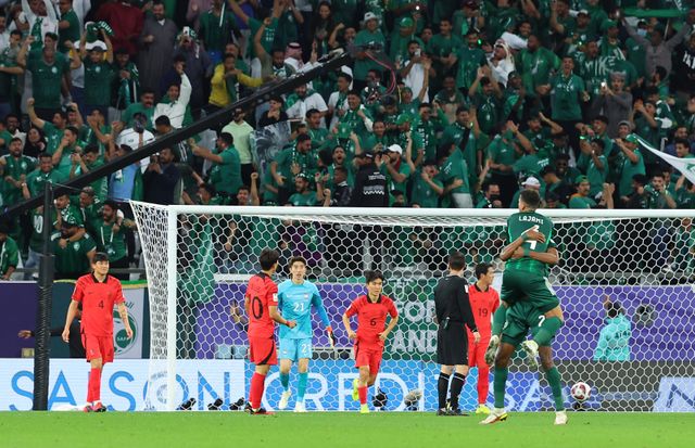 (알라이얀=연합뉴스) 김도훈 기자 = 30일(현지시간) 카타르 알라이얀에서 에듀케이션 시티 스타디움에서 열린 2023 아시아축구연맹(AFC) 아시안컵 16강전 한국과 사우디아라비아의 경기. 사우디에게 선취골을 내준 대표팀 선수들이 아쉬워하고 있다. 2024.1.31