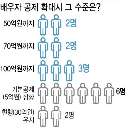 현재 상속 및 증여세는 과세 표준이 30억원을 초과하는 경우 최고 세율인 50%가 적용되고 있다. 배우자 공제는 부부의 재산은 함께 노력해 축적한 공동 재산인 만큼 부부 간 상속이 이뤄질 때에는 이에 따른 세금을 부과하지 않겠다는 취지다.