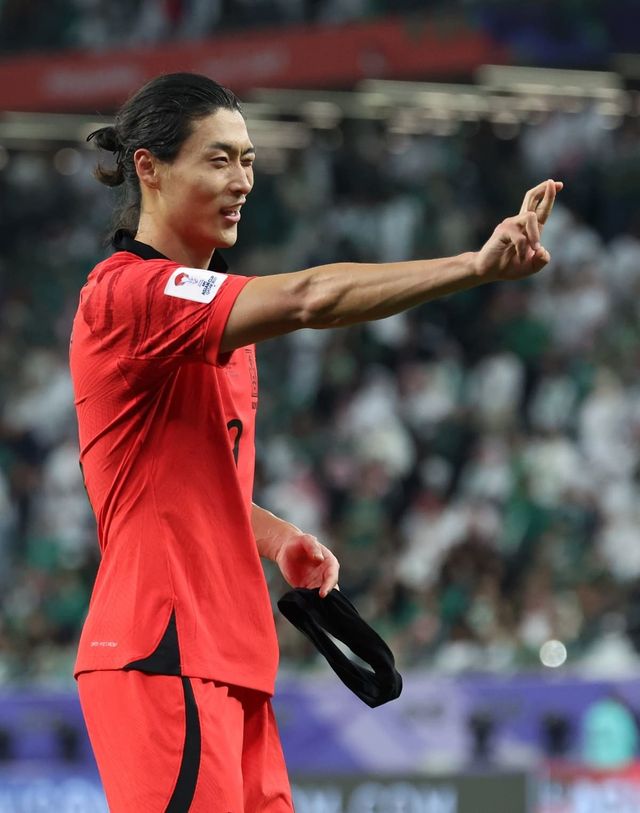 대한민국 조규성이 30일(현지시간) 카타르 알라이얀 에듀케이션 시티 스타디움에서 열린 2023 아시아축구연맹(AFC) 카타르 아시안컵 16강전 대한민국과 사우디아라비아의 경기에서 동점골을 넣은 후 세리머니를 하고 있다. / 뉴스1