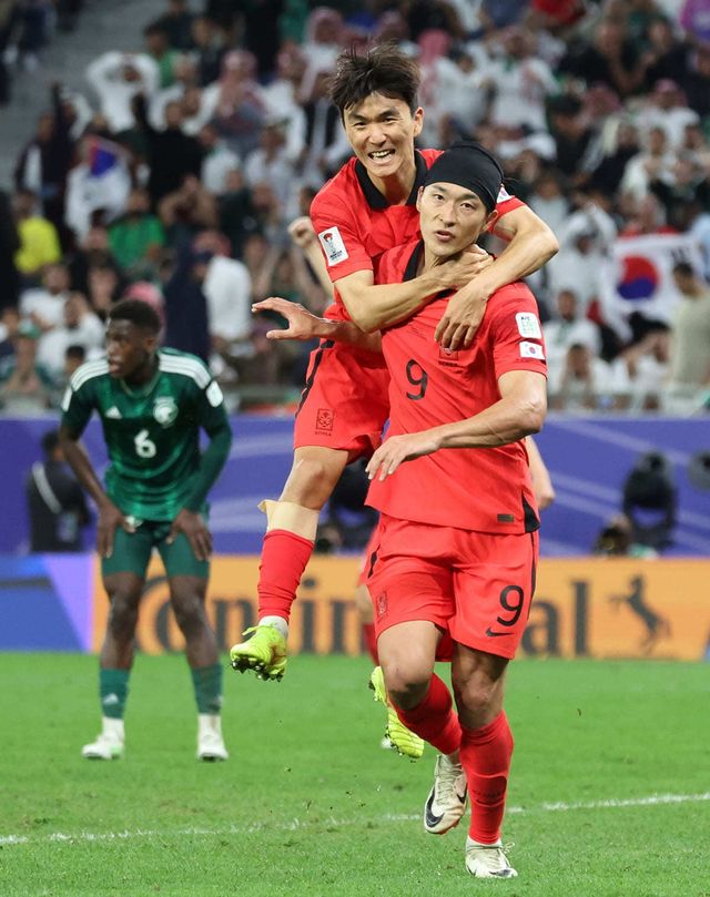 대한민국 조규성이 30일(현지시간) 카타르 알라이얀 에듀케이션 시티 스타디움에서 열린 2023 아시아축구연맹(AFC) 카타르 아시안컵 16강전 대한민국과 사우디아라비아의 경기에서 동점골을 넣은 후 황인범과 기뻐하고 있다. / 뉴스1