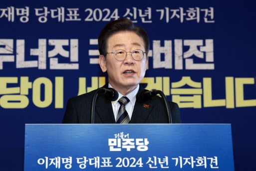 이날 회견문 낭독이 끝난 후 이 대표는 기자들로부터 선거제 관련 질문을 받았다. 여당인 국민의힘이 병립형 비례대표제 회귀를 고수하는 가운데 민주당의 입장이 무엇인지 물어본 것이다.