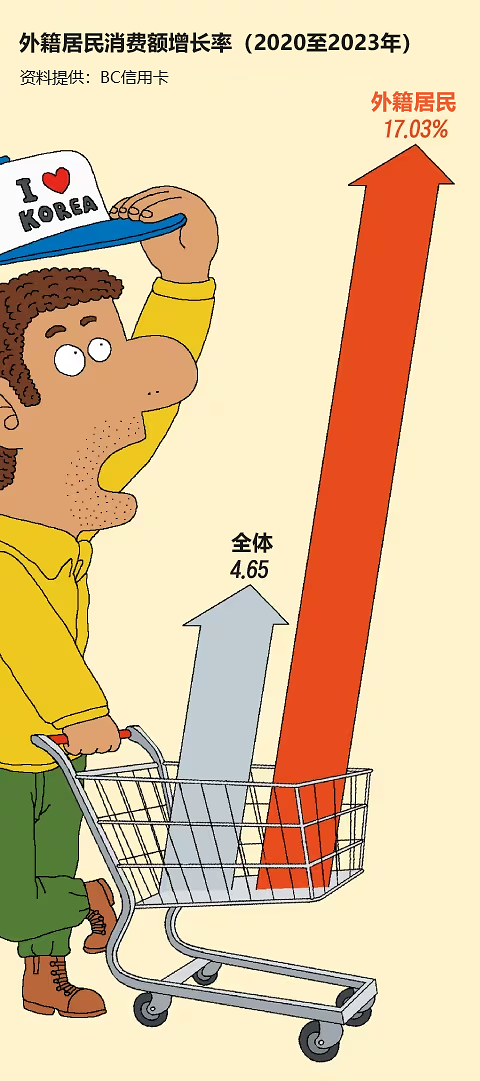 1日,BC信用卡新金融研究所分析近3年(2020年至2023年)在韩持外国人登录证(ARC)办理BC信用卡的外籍居民信用卡使用明细并发布相关报告显示,外籍居民信用卡消费金额年均增长17.03%,是同期韩国用户消费增长率(年均4.65%)的3.7倍。