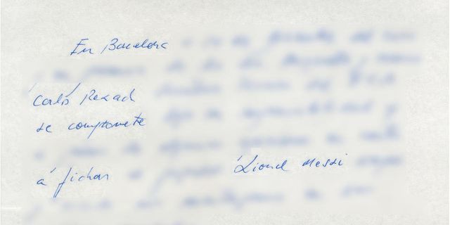 당시 식당에 있던 냅킨을 활용한 계약서에는 “2000년 12월 14일 바르셀로나에서 밍겔라 씨와 호라시오 씨의 입회하에 FC 바르셀로나의 스포팅 디렉터인 카를레스 렉사흐는 본인의 책임 하에 반대 의견에 관계없이 합의된 금액을 준수하는 조건으로 리오넬 메시 선수와 계약하는 데 동의합니다”라고 쓰여 있다.