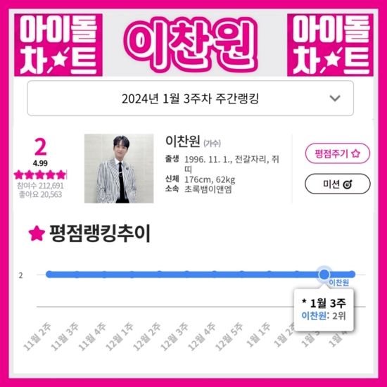 (엑스포츠뉴스 이정범 기자) '찬또배기' 이찬원이 1월 3주 차 아이돌차트 평점 랭킹 2위에 올랐다.