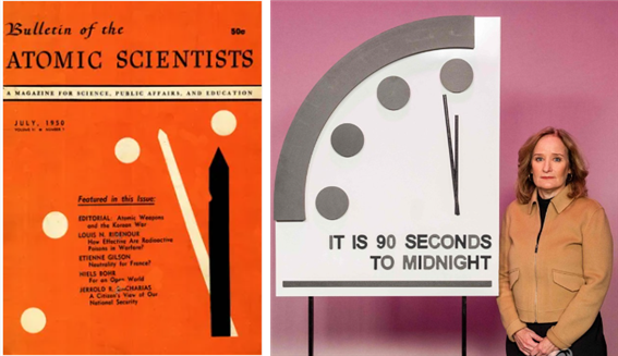 이처럼 가공할만한 위력을 현실적으로 확인한 미국의 핵과학자들은 2년 뒤인 1947년 ‘Doomsday Clock’을 만들어 핵무기로 인한 인류의 파멸 가능성을 전 세계에 경고하기 시작했다. 여기에는 현대 물리학의 거장 앨버트 아인슈타인과 맨해튼 계획의 연구책임자 로버트 오펜하이머 등이 앞장섰다. 그 첫 작업으로 미국 시카고대학에서 발행하는 핵과학회지 <불리틴 : The Bulletin of Atomic Scientists)의 표지에 <자정 7분 전>으로 표시된 시계 그림을 게재한 것이 오늘날까지 이어진 <지구 종말 시계> 또는 <인류 종말 시계>, <운명의 날 시계>이다.