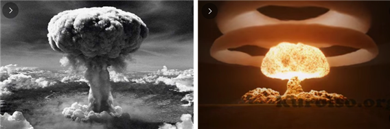 ▲ 1945년 8월 7일 일본 히로시마 상공에서 인류 최초의 원자폭탄 ‘리틀 보이’가 버섯구름을 일으키며 폭발하는 모습(왼쪽)과 1961년 10월 30일 옛 소련 북극권 영토에서 폭발한 인류 역사상 최악의 무기 ‘차르 봄바’의 지름 8㎞ 불덩어리(화구. 火球) 및 고리 형태의 핵구름 모습. 원자폭탄을 기폭제로 사용한 수소폭탄 ‘차르봄바’의 폭발 위력은 히로시마 원자폭탄의 3,300배라고 한다. 원자폭탄은 핵분열 에너지를, 수소폭탄은 핵융합 에너지를 폭발력으로 사용한다.