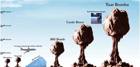 ▲ 1945년 히로시마 원자폭탄 이후 각 원자폭탄 및 수소폭탄의 핵구름 위력 비교. 왼쪽부터 히로시마 및 나가사키 원자폭탄, 그리고 에베레스트산(8,848m)과 여객기 고도(12,000m), 1983년 미국의 B83 Bomb, 1954년 미국의 캐슬브라보, 1961년 옛 소련의 차르봄바 순이다. 역사상 최악의 폭발력을 보인 ‘차르봄바’는 불덩이(화구. 火球)만도 지름 8㎞나 되었고, 핵구름은 에베레스트산의 7배가 넘는 67㎞ 상공까지 치솟았다.
