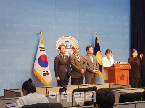 미래대연합 공동대표들과 2일 민주당 탈당 기자회견을 하는 양소영 민주당 대학생위원장(사진 오른쪽에서 두번째)