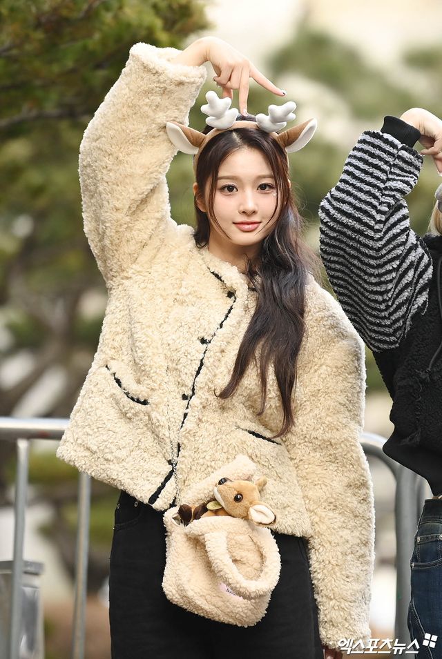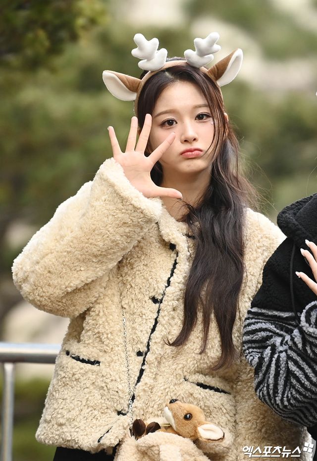 엔믹스 설윤이 출근길에 포즈를 취하고 있다.