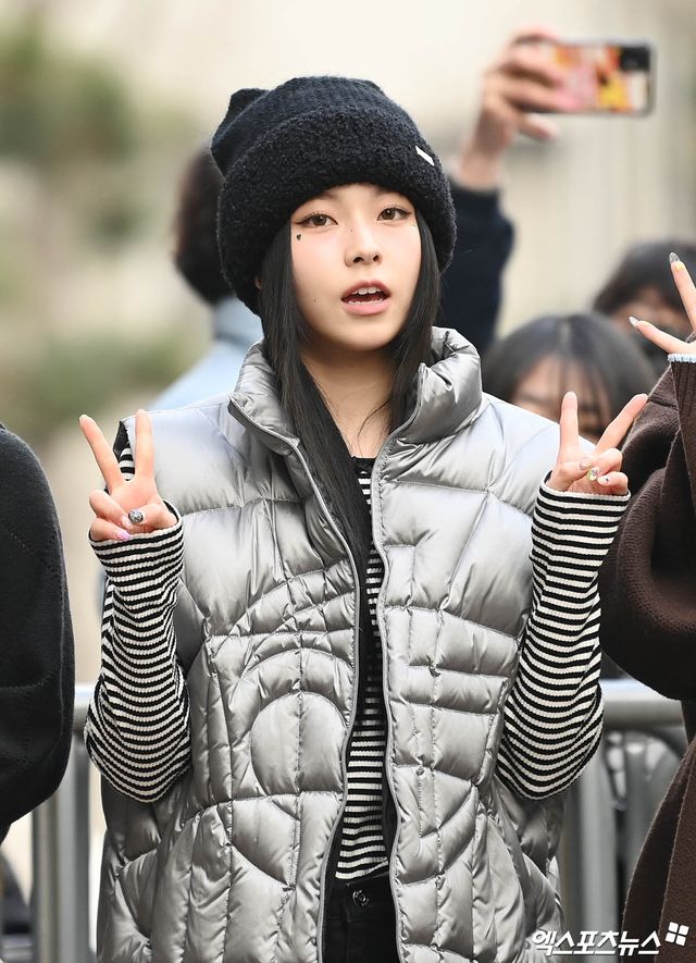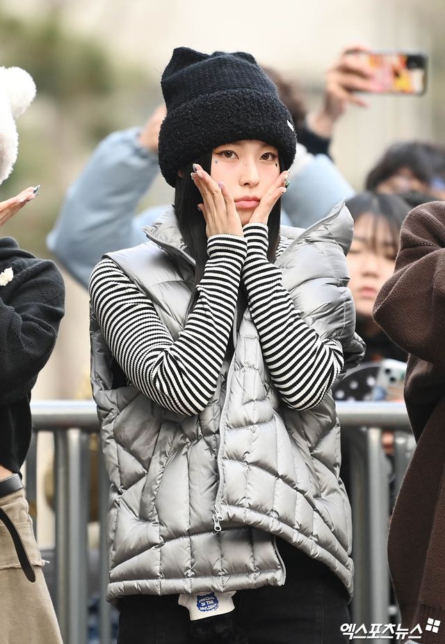 엔믹스 규진이 출근길에 포즈를 취하고 있다.