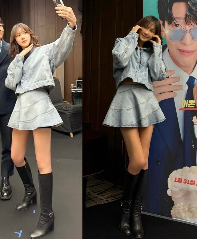 이지아는 크롭한 기장의 데님 재킷과 플레어 디자인의 초미니 데님 스커트를 셋업으로 입고 일명 '청청 패션'을 연출했다. 그녀는 상큼하고 발랄한 데님룩에 블랙 가죽 롱부츠를 신어 시크한 무드를 더했다. 특히 우월한 신체 비율과 쭉 뻗은 각선미가 시선을 사로잡았다.