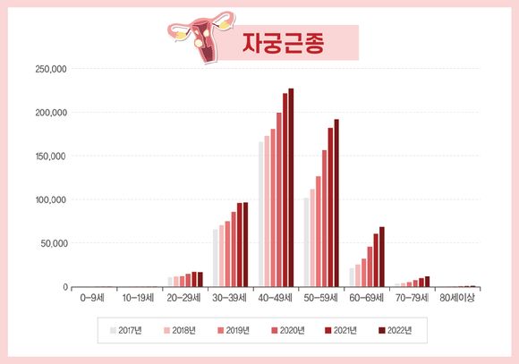 환자는 계속 느는 추세로 2018년 39만2334명에서 2022년 60만7526명으로 5년 전과 비교해 66% 이상 환자가 늘었다. 환자 수는 가임 연령대인 30~40의 경우, 2022년에 32만3506명으로 전체 자궁근종 환자의 50% 이상을 차지했다. 50대도 증가세를 보였다.