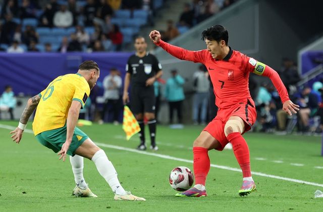 한국 손흥민이 2일(현지 시각) 카타르 알와크라 알자누브 스타디움에서 열린 2023 아시아축구연맹(AFC) 카타르 아시안컵 8강전 호주와 한국의 경기에서 돌파하고 있다. / 뉴스1