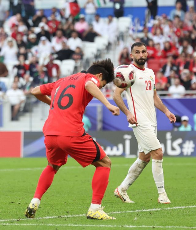 한국 축구대표팀 박진섭이 지난달 20일(현지 시각) 카타르 도하 알투마마 스타디움에서 열린 2023 아시아축구연맹(AFC) 카타르 아시안컵 조별리그 E조 조별리그 2차전 요르단과 한국의 경기에서 헤더를 하고 있다. / 뉴스1