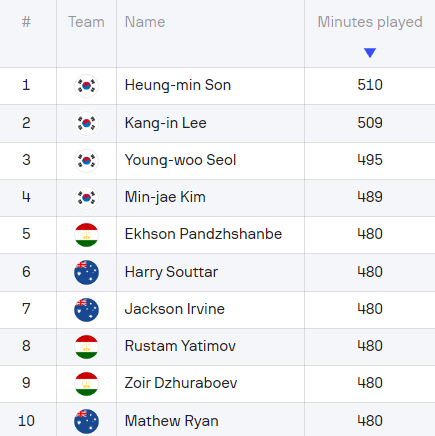 이로 인해 이번 아시안컵 출전시간 1위부터 4위까지 모두 한국 대표팀이라는 웃지 못할 기록도 쓰고 있다. 5위부터 10위는 각 호주와 이란 대표팀이 480분이었다.