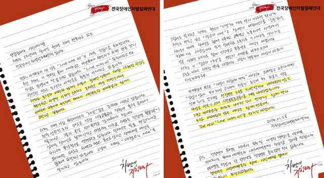 이어 "수많은 차별과 혐오, 욕설도 삼키고 장애 해방 세상을 꿈꾸며 투쟁하고 있다"면서 "성 소수자도 노동자도 이 세상을 살아가는 모든 사회적 소수자도 함께 인정받고 존중받는 세상을 바란다"고 밝혔습니다.