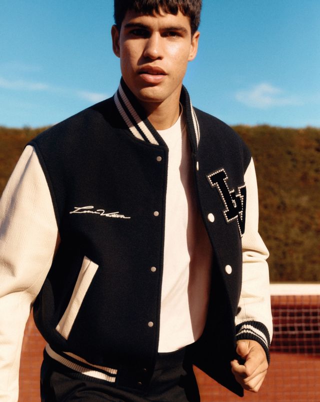 블랙 바시티 블루종과 인사이드 아웃 티셔츠,다모플라주 플래티드 팬츠 모두 Louis Vuitton