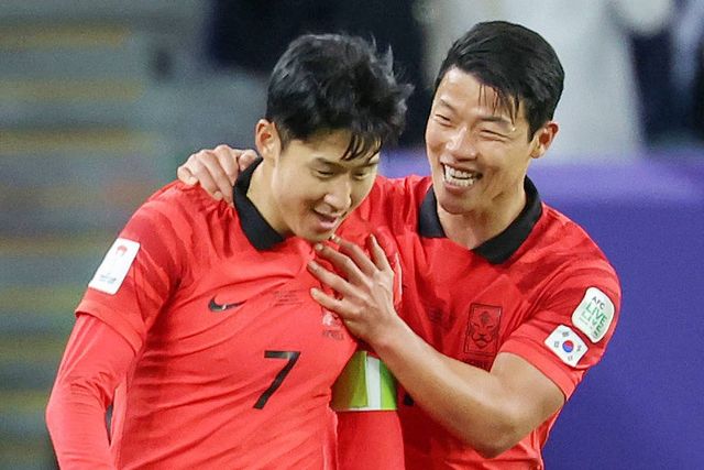 대한민국 손흥민이 지난 2일(현지시간) 카타르 알와크라 알자누브 스타디움에서 열린 2023 아시아축구연맹(AFC) 카타르 아시안컵 8강전 호주와 대한민국의 경기에서 연장 전반 프리킥골을 넣은 후 황희찬과 기뻐하고 있다 / 뉴스1