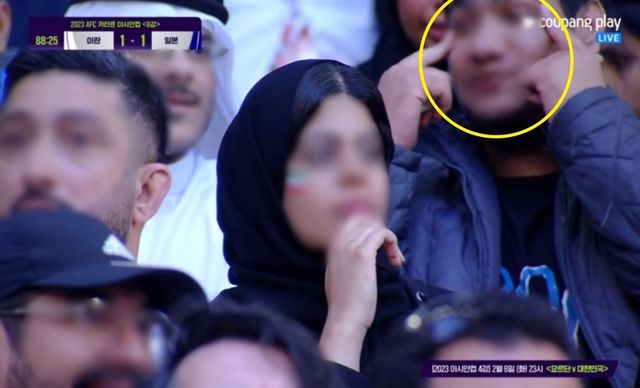 한 이란 관객이 인종차별 제스처를 하고 있다. / 쿠팡플레이 스포츠