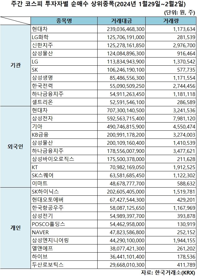 기관 '현대차'·외인 '현대차'·개인 'SK하이닉스' 1위 [주간 코스피 순매수- 1월29일~2월2일]