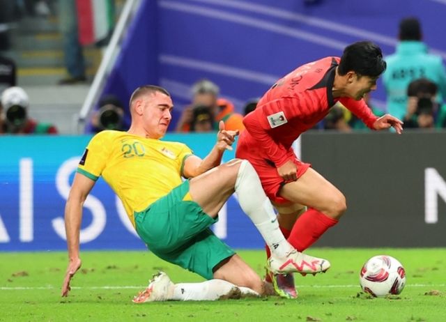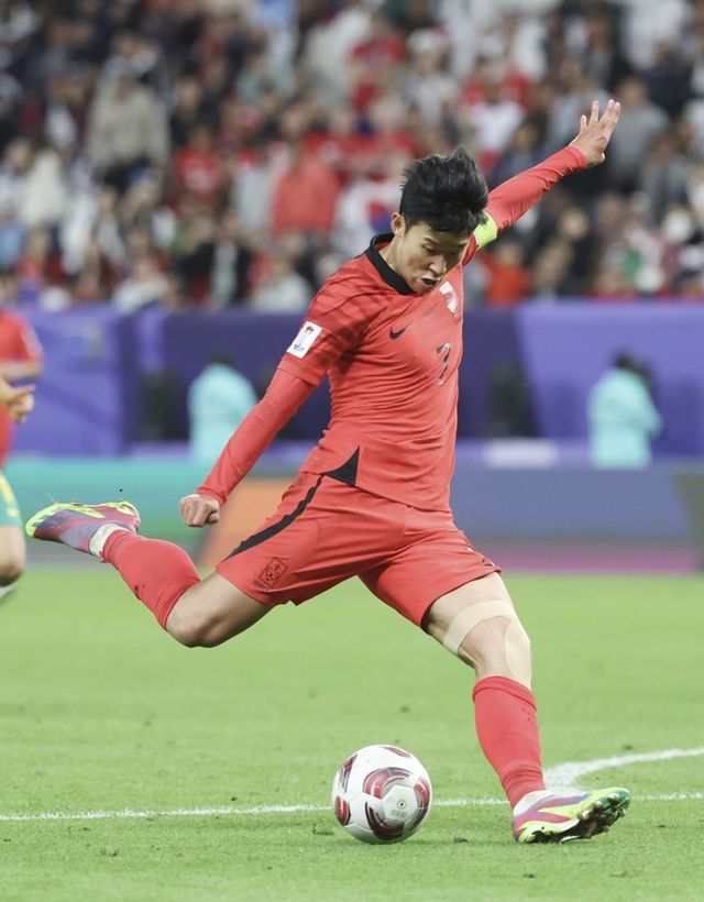 대한민국 손흥민이 2일(현지시간) 카타르 알와크라 알자누브 스타디움에서 열린 2023 아시아축구연맹(AFC) 카타르 아시안컵 8강전 호주와 대한민국의 경기에서 연장 후반 추가 슈팅을 때리고 있다. /뉴스1