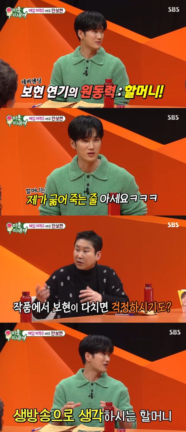 이날 신동엽은 "안보현 씨가 쉬지 않고 작품을 이어 가는 이유가 할머니 때문이래요"라고 모두에게 알렸다. 안보현은 맞다고 동의했다.