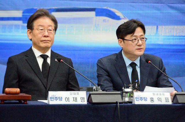 홍익표 더불어민주당 원내대표가 5일 오전 광주 서구 치평동 김대중컨벤션센터에서 열린 더불어민주당 광주 현장 최고위원회의에서 발언하고 있다. 왼쪽은 이재명 대표. / 뉴스1