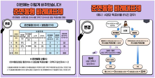 2020년 제21대 총선부터는 준연동형 비례대표제가 도입됐다. 준동형 비례대표제는 비례대표 의석을 지역구 선거결과와 연동하여 배분(50%)하는 것을 의미한다. 비례대표 총 의석수를 '준연동형(30석)+병립형(17석)'으로 구성하는 것이다. 준연동형 산출식은 '(의석할당정당 총의석수X정당별 득표비율-지역구 당선자수)÷2'다.