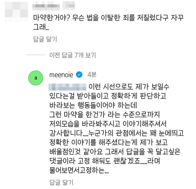 미노이는 이에 "이런 시선으로도 제가 보일 수 있다는 걸 받아들이고 정확하게 판단하고 바라보는 행동들이어야 하는데 그런 '마약을 한 건가'라는 수준으로까지 제 모습을 바라봐 주시고 이야기 해주셔서 감사하다"라고 답글을 남겼다.