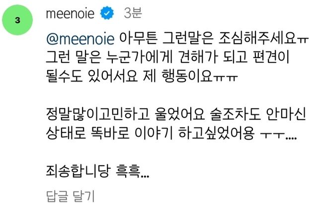 또 재차 답글을 남겨 "아무튼 그런 말은 조심해 달라. 제 행동이 누군가에게 견해가 되고 편견이 될 수도 있다. 정말 많이 고민하고 울었다. 술 안 마신 상태로 똑바로 이야기 하고 싶었다. 죄송하다"라고 말했다.