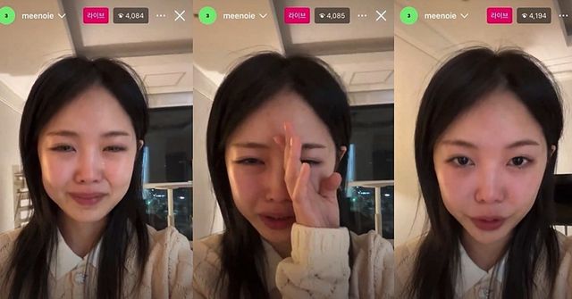 5일 새벽 인스타그램 라이브 방송을 진행한 가수 미노이(박민영)가 눈물을 흘리고 있다. 소셜미디어 X(옛 트위터)에 공유된 당시 라이브 방송 영상 캡처 / 미노이 인스타그램-X(옛 트위터)