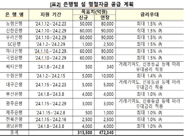 은행권 또한 설 연휴 전후로 중소기업에 거래기여도, 신용등급 등에 따른 금리우대 등을 반영하여 총 78조8000억원(신규 31조6000억원, 만기연장 47조2000억원)의 대출을 공급할 계획이다. 오는 29일까지 신청을 받는다.