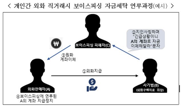 아울러 설 연휴 해외여행 후 남은 소액 외화현찰을 온라인 플랫폼이나 직거래를 통해 개인간 사고파는 과정에서 보이스피싱 사기범이 외화를 사는 사람으로 위장해 보이스피싱으로 편취한 자금(원화)을 계좌이체 등으로 지급함으로써 자신도 모르는 사이 보이스피싱 자금세탁에 연루될 수 있어 주의가 요구된다.