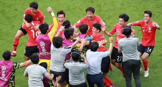 지난 2018년 6월 러시아 카잔 아레나에서 열린 2018 러시아 월드컵 F조 조별리그 3차전 한국과 독일의 경기. 김영권의 슛이 골로 인정되자 손흥민, 김영권, 장현수 등이 환호하고 있다. 사진=연합뉴스