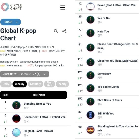 써클차트(구 가온차트)를 운영하는 한국음악콘텐츠협회에 따르면, 주간 글로벌 K-POP 차트(1월 21일~27일 자)에서 방탄소년단(BTS) 정국의 'GOLDEN'(골든) 앨범 타이틀곡 'Standing Next to You'(스탠딩 넥스트 투 유)가 1위에 올랐다. 이로써 이 노래의 연속 1위 기록은 11주로 늘어났다.