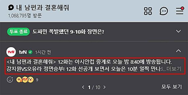 6일 제작진 측은 "2023 AFC 카타르 아시안컵 축구 중계 일정으로 '내 남편과 결혼해줘' 12회는 10분 앞당긴 오후 8시 40분 방송된다"라고 전했다.