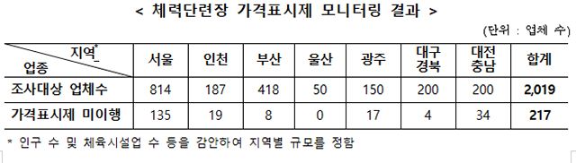 [더팩트ㅣ세종=박은평 기자] 전국 주요 도시 체력단력장(헬스장) 중 10%에 달하는 업체가 가격표시를 제대로 하지 않는 것으로 조사됐다.