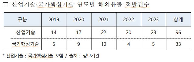 2019~2023년 산업기술·국가핵심기술 해외유출 적발건수는 모두 96건이다. 2019년 14건, 2020년 17건, 2021년 22건, 2022년 20건, 2023년 23건으로 뚜렷하게 증가하는 추세다. 이중 반도체 등 국가핵심기술 유출은 33건이다.