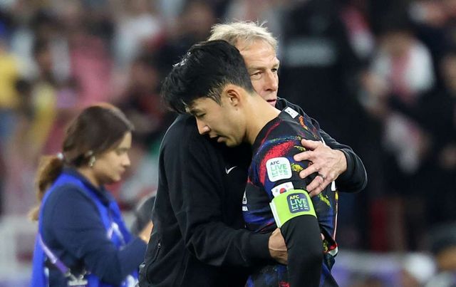 대한민국 위르겐 클린스만 감독이 지난 6일(현지 시각) 카타르 알라이얀 아흐메드 빈 알리 스타디움에서 열린 2023 아시아축구연맹(AFC) 카타르 아시안컵 준결승 요르단과 대한민국의 경기에서 0-2로 패배하며 결승 진출이 좌절된 후 실의에 빠진 손흥민을 다독이고 있다. / 뉴스1