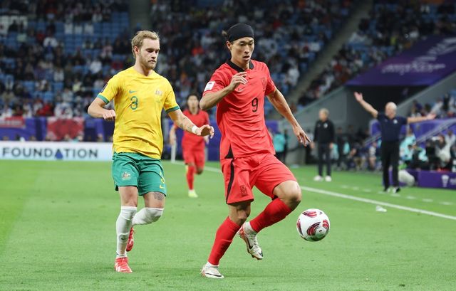 대한민국 조규성이 지난 2일(현지 시각) 카타르 알와크라 알자누브 스타디움에서 열린 2023 아시아축구연맹(AFC) 카타르 아시안컵 8강전 호주와 대한민국의 경기에서 돌파하고 있다. / 뉴스1